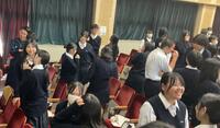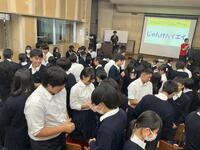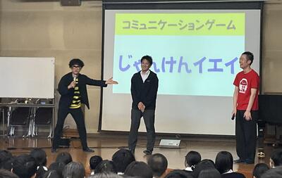 10月10日(金)に1、2年生を対象に進路を考える日②を実施しました。お笑いコンビ「かにゃ」さんを講師に招き、丸沢丸さんとビンオさんの軽妙な語りとボケを楽しみながら、「仕事」「働く」をテーマに自分の進路について考えを深めました。